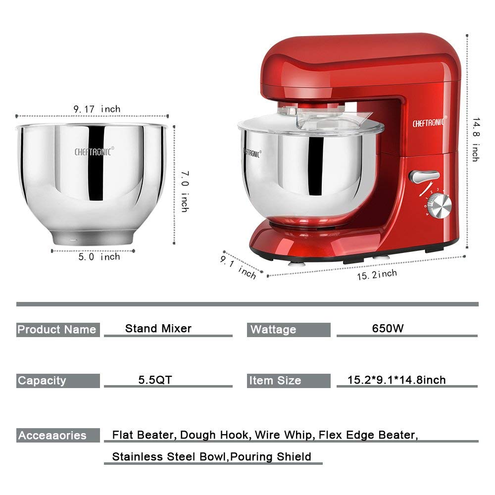 CHEFTRONIC Mezcladoras de pie con cabezal de inclinación SM-986 120V / 650W 5.5qt Tazón 6 mezclador eléctrico de cocina de velocidad