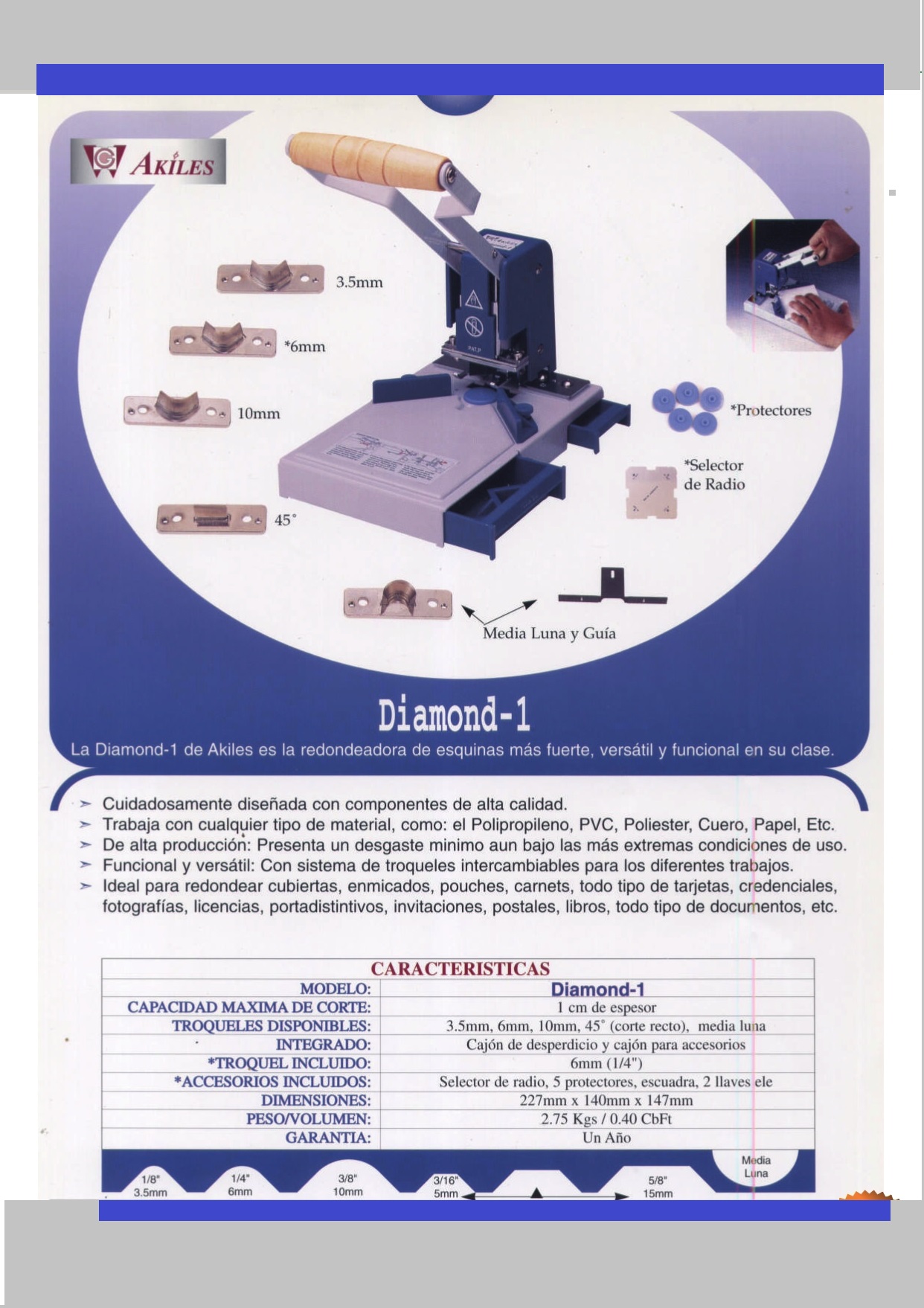 El Akiles diamante 1 esquina máquina de redondeo es una de las máquinas de redondeo más fuertes y más eficientes esquina manual de su clase. Si usted está buscando un resultado profesional y consistente esta máquina redondeo de esquinas es para usted. La máquina en curva redonda viene de serie con el 1/4 " morir, pero 1/8 " , 3/8 " , 45 grados (recto ) , y la media luna Diez se pueden comprar por separado. Aquí hay más información sobre el diamante 1