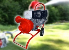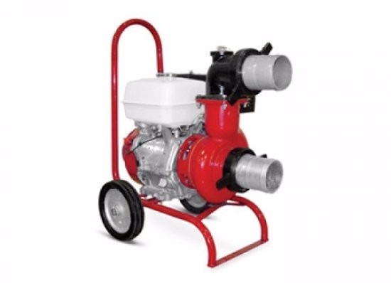 Motobomba de gran caudal de 3″ de diámetro de succión y descarga montada sobre una carretilla con dos ruedas.