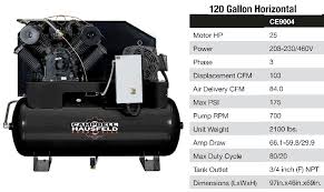 El compresor Campbell Hausfeld de 120 galones, 25 hp, horizontal, de dos etapas (CE9004) es ideal para instalaciones de reparación de automóviles, puntos de reparación de neumáticos y pequeñas instalaciones de fabricación. Este compresor de aire tiene un alto flujo de aire de 87 CFM a 90 PSI para alimentar múltiples herramientas de aire de alta demanda. Su motor NEMA de calificación industrial funciona con energía eléctrica trifásica, impulsando una bomba de dos etapas de hierro fundido de larga vida útil, diseñada para ofrecer más de 15,000 horas de operación.