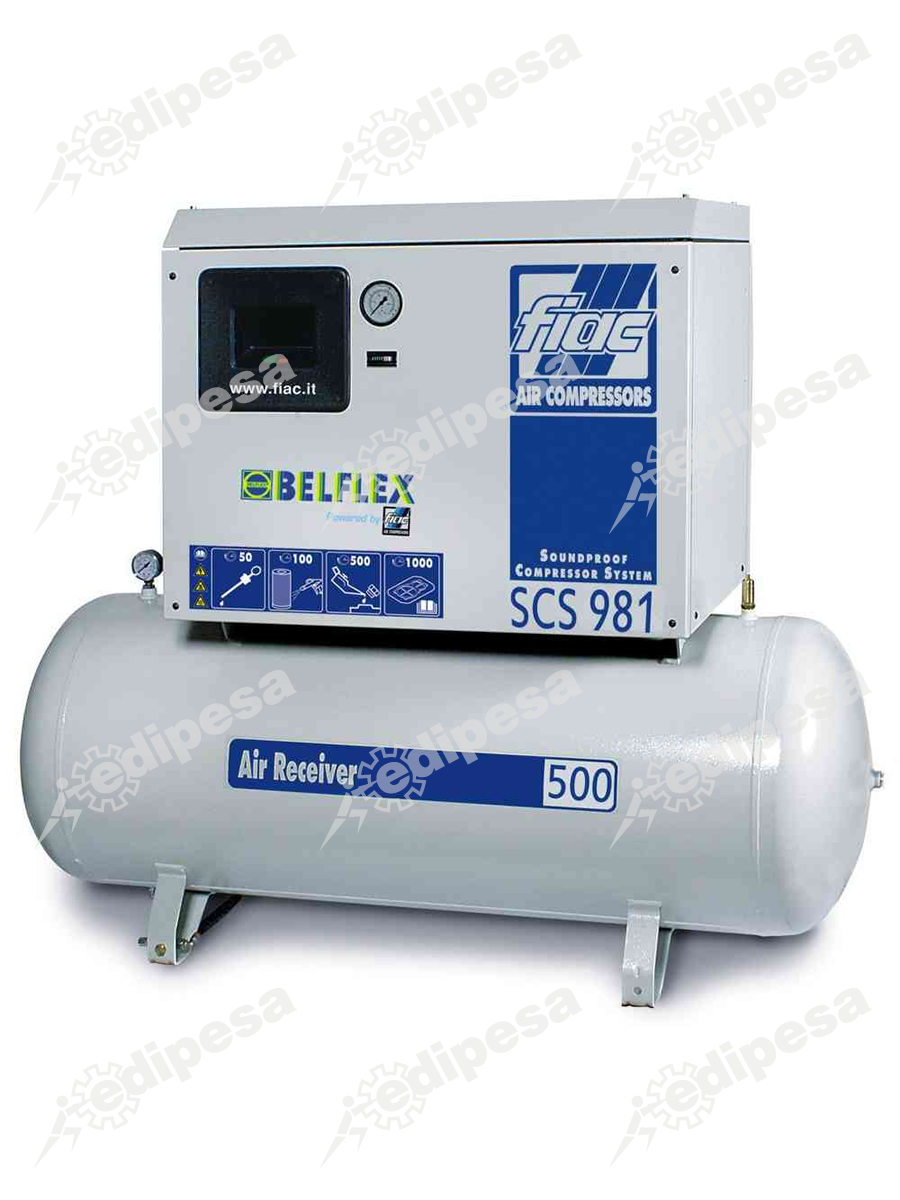 EN Silent piston air compressor. The new SCS series have been designed with the aim of developing simple machines with easy maintenance: reduced number of special components, same performance levels, reduced temperature internally and at the air outlet. Operates with a pressure switch with amperometric relay and overload protection, houmeter, two stages pumping unit, reduction of maintenance costs.