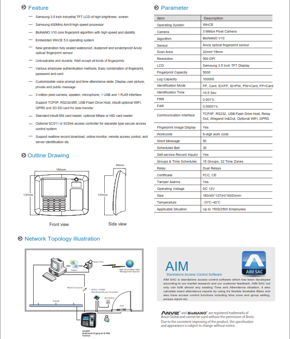 OA1000 es un gran adelanto por Anviz en terminales de identificación biométrica, que integran la huella dactilar identificación, RFID, cámara, WiFi, multimedia y sistema tecnología incorporada plenamente. Utilizando 3.5inch industrial color verdadero TFT LCD, Samsung 400 MHz Arm9 alta velocidad procesador y sistema operativo de Windows CE. OA1000 puede utilizarse en todas las aplicaciones donde se requiere la identificación de huellas digitales especialmente en los gobiernos y las empresas de mayor escala como lugares donde el nivel de seguridad es una necesidad.