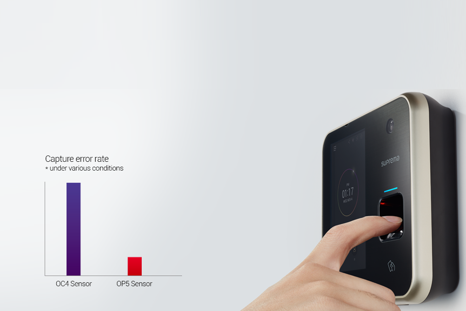 BioStation A2 combina la ventaja del nuevo sensor OP5 con el algoritmo mejorado para huellas dactilares de Suprema a fin de ofrecer la mejor precisión del mundo. El área de sensor ampliada junto con la incorporación de las nuevas técnicas de captura y procesamiento de huellas dactilares, como el control de ganancia adaptable, la compensación de distorsión y la reducción de ruidos, permiten a BioStation A2 reducir la tasa de errores de captura en distintos entornos.