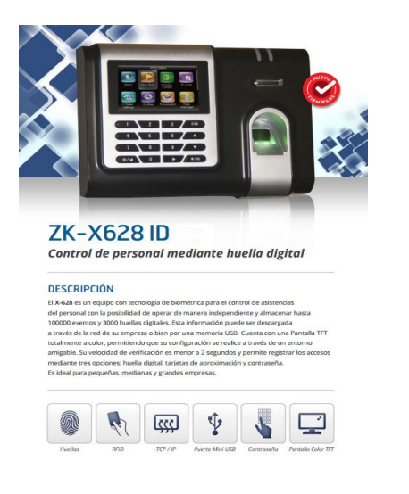 El X-628 es un equipo con tecnología de biométrica para el control de asistencias del personal con la posibilidad de operar de manera