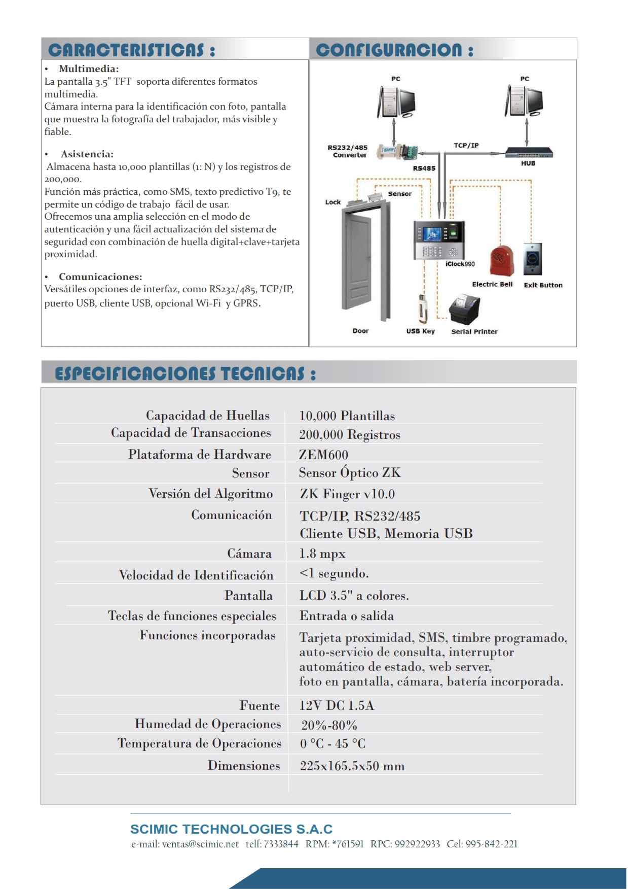 Tiene capacidad de 100,000 registros; cuenta con una marcaciòn de huella, password, tarjeta. La plataforma de hardware es ZEM 510.