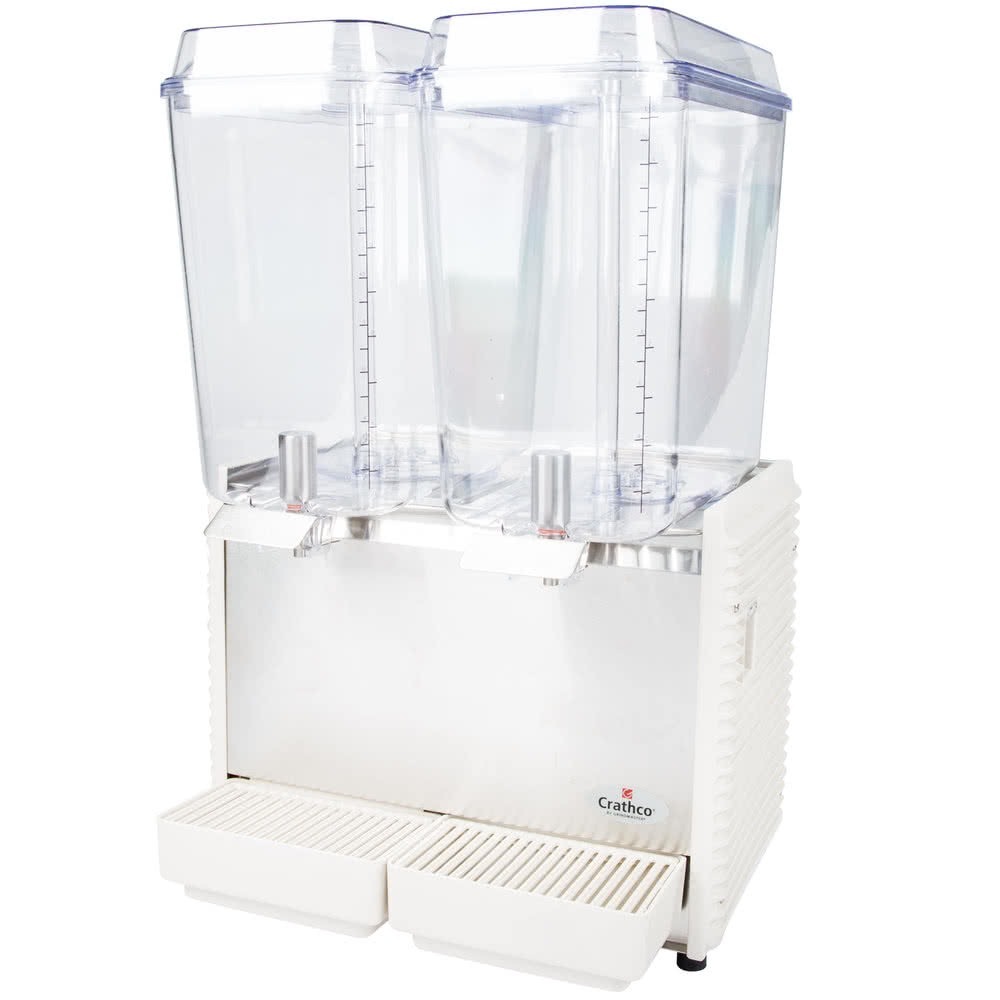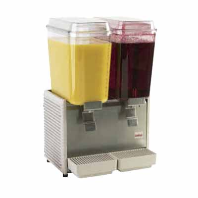 Refresquera con base de acero inoxidable y laterales de policarbonato, válvulas dispensadoras sin goteo, fácil de usar y mantener.
