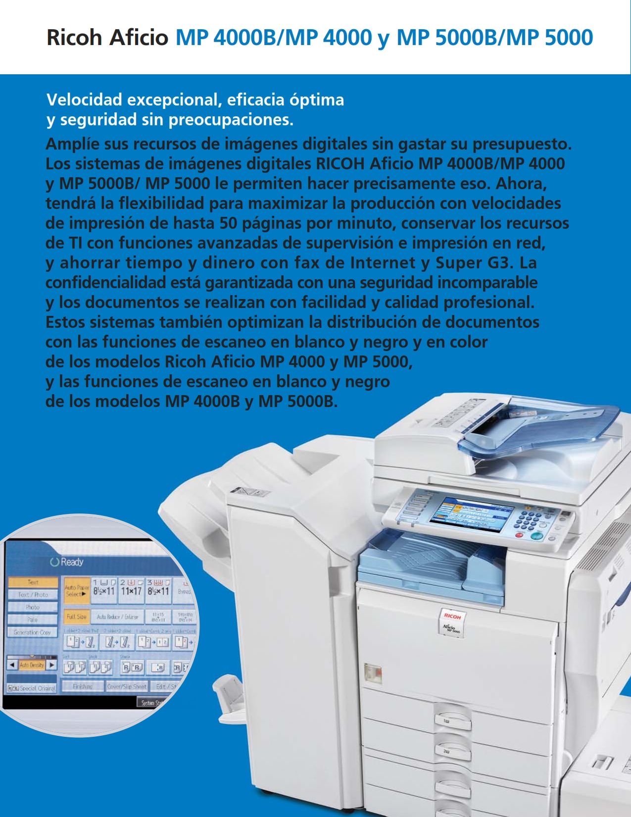 Los sistemas de imágenes digitales RICOH Aficio MP 4000B/MP 4000 y MP 5000B/ MP 5000 le permiten hacer precisamente eso. Ahora, tendrá la flexibilidad para maximizar la producción con velocidades de impresión de hasta 50 páginas por minuto, conservar los recursos de TI con funciones avanzadas de supervisión e impresión en red, y ahorrar tiempo y dinero con fax de Internet y Super G3. La confidencialidad está garantizada con una seguridad incomparable y los documentos se realizan con facilidad y calidad profesional.