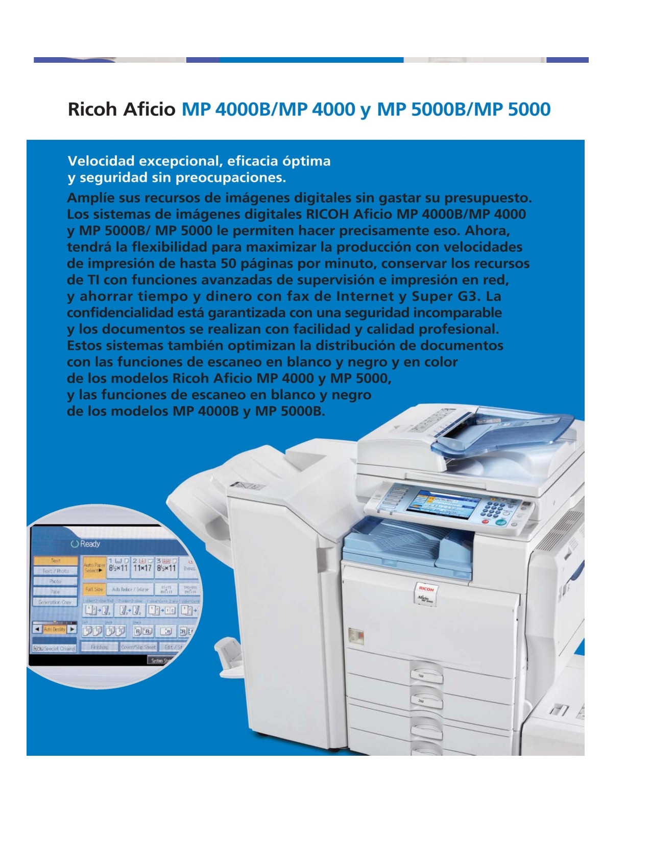 Para una veloz conectividad de red y rápidos índices de transferencia de datos, la serie Ricoh Aficio MP 4500 se encuentra equipada con interfaces Ethernet 10/100BaseTX y USB 2.0.