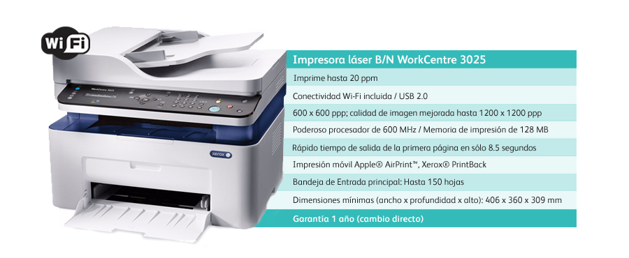 Multifuncional láser Xerox WorkCentre 3025V, imprime/escanea/copia/USB 2.0/Wi-Fi.