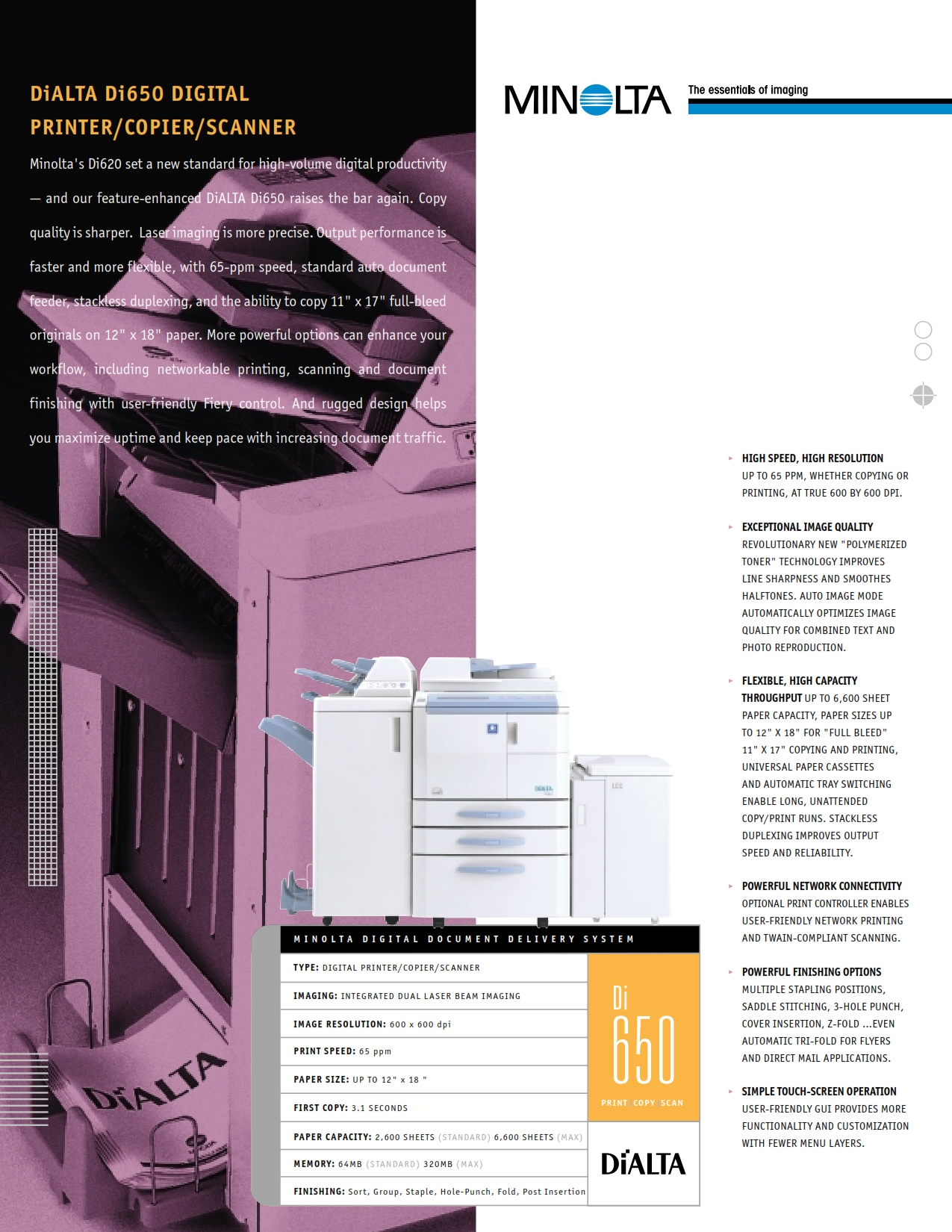 La Minolta Dialta 650 ofrece alta velocidad, alta calidad en tan sólo 3 segundos a una velocidad nominal de 55 páginas por minuto en tamaño A4.