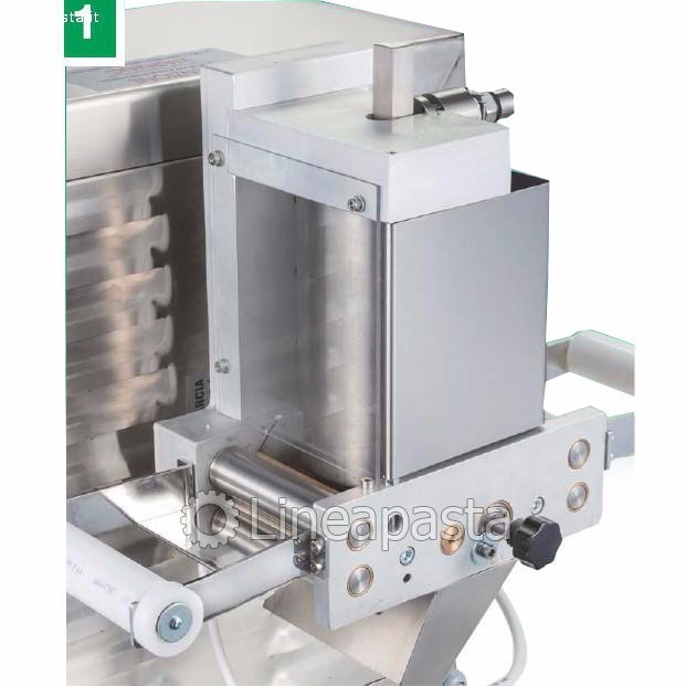 Grupo Ravioli: le permite preparar ravioli perfectos de doble hoja. El grupo Ravioli tiene el molde fijo integrado en la máquina y una vez que se ha elegido el formato de producción (mm 20x20, 34x40, 40x50, 70x70x70), esto no se puede cambiar sin comprar un nuevo Grupo Ravioli.