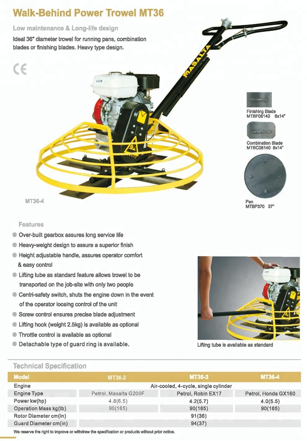 Dale el mejor acabado a las superficies de tus trabajos en concreto. La alisadora MT36-4 de Masalta cuenta con un potente motor Honda GX16O de 5,5 HP y 4 tiempos refrigerado por aire. El sistema de rotación independiente del volante permite el funcionamiento de la máquina en lugares de difícil acceso. Por otro lado, gracias a su interruptor de seguridad, estarás siempre seguro debido a que se apaga el motor si se llega a perder el control de la unidad.
