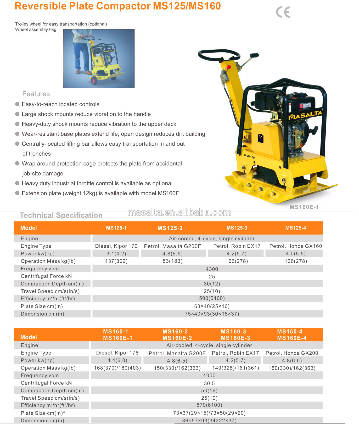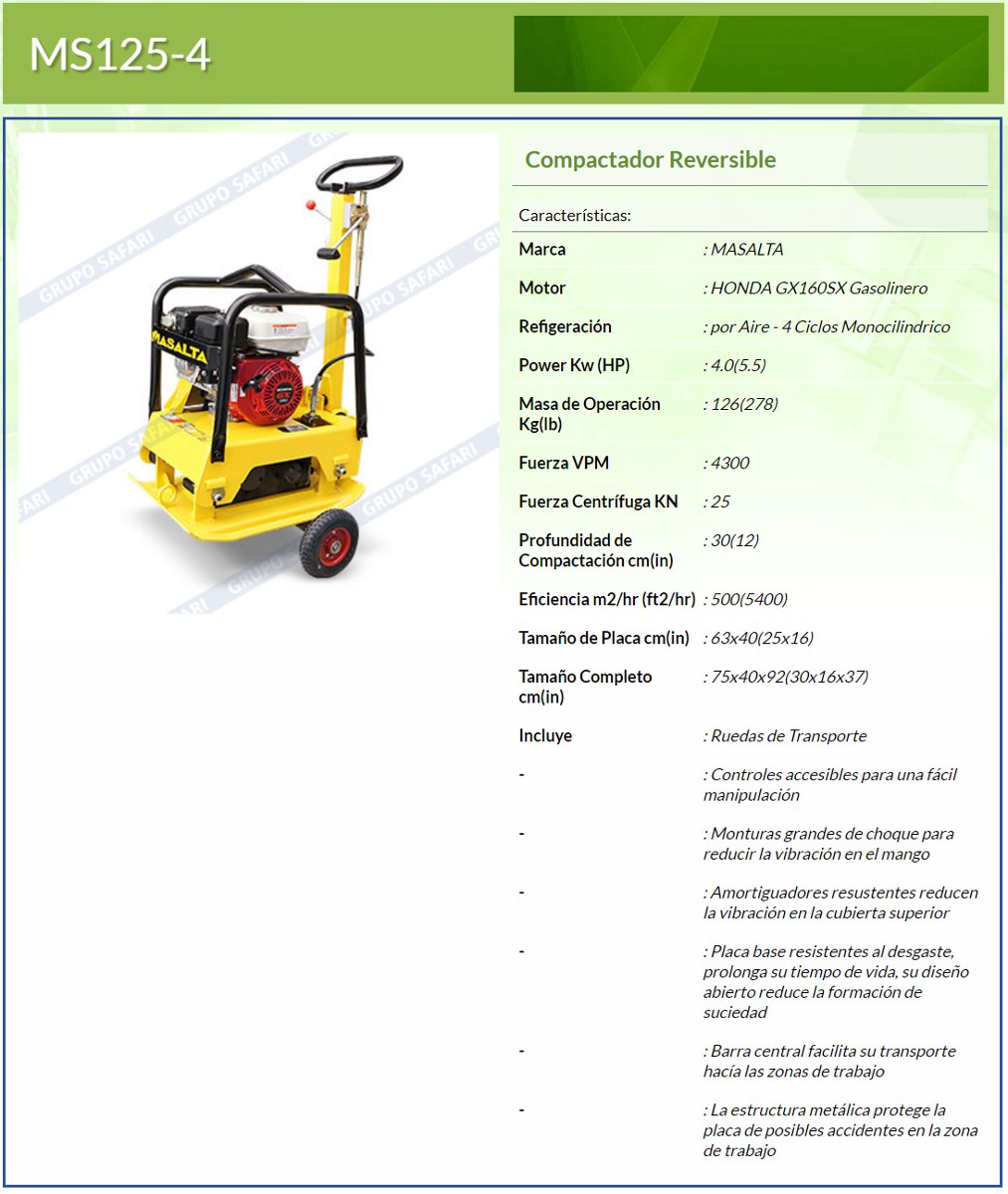 El compactador de placa reversible MS125 es de fácil manejo e incorpora controles de fácil alcance. Los montajes de golpes fuertes están colocados de madera que aíslan el mango de las vibraciones. Una carcasa de protección envolvente evita que la placa sufra daños por el bombeo diario. La rueda del carrito está disponible como accesorio opcional y ofrece un fácil transporte del compactador de placa vibratoria reversible.
