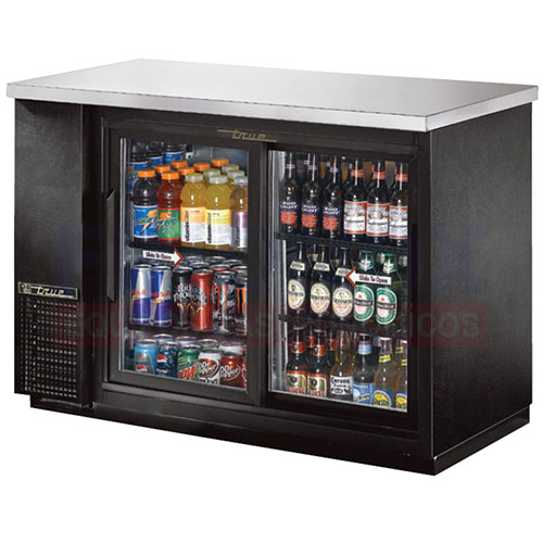 Refrigerador de barra posterior, dos secciones, 24 "de profundidad, 35-5 / 8" de alto, (48) paquetes de 6 o (2) capacidad de 1/2 barril, (4) estantes de cables, unidad de condensación en la parte izquierda, tapa de acero inoxidable , interior galvanizado con piso de acero inoxidable, exterior de vinilo negro, (2) puertas corredizas de vidrio, luz interior LED, refrigerante de hidrocarburo R290, 1/5 HP, 115v / 60/1, 2.1 amperios, NEMA 5-15P, cULus, UL EPH Clasificado, hecho en estados unidos