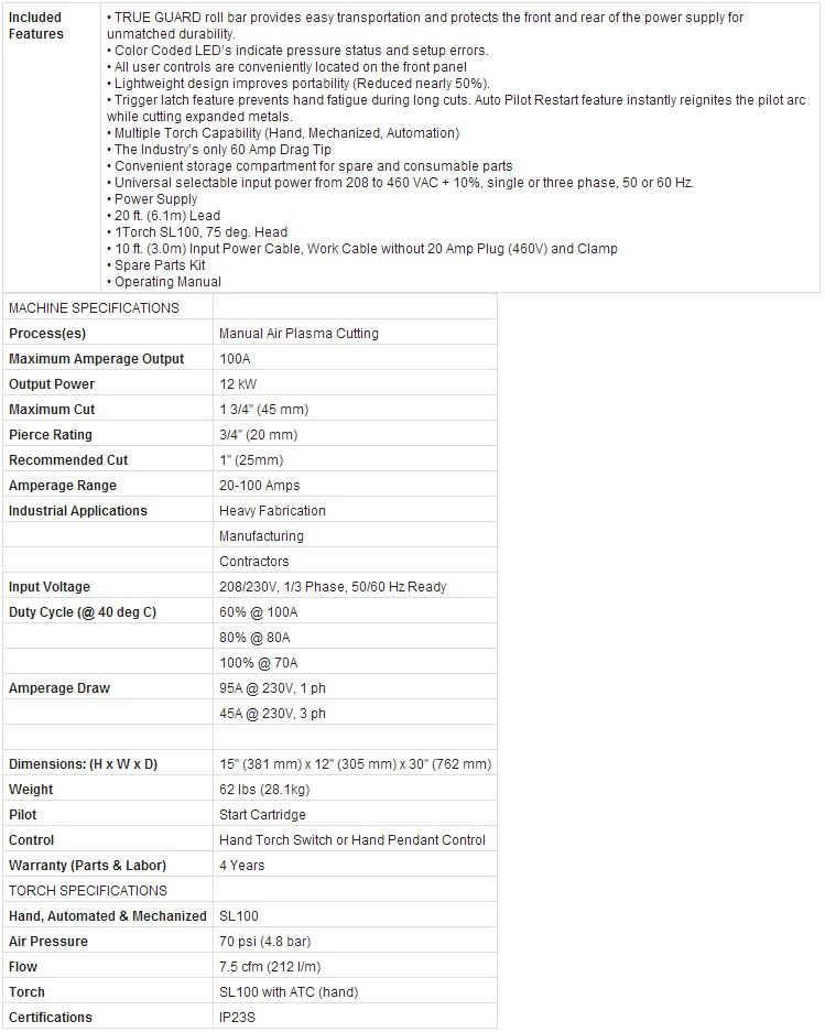 El cortador de plasma Thermal Dynamics Cutmaster 102 (1-1330-1) es la máquina de corte de 1 pulgada más rápida del mercado hoy en día. Es ligero, el diseño compacto combinado con la selección de voltaje múltiple lo convierte en la máquina de corte más portátil y potente disponible. Thermal Dynamics ha incluido el 1Torch y tiene una capacidad máxima de 1 3/4 pulgada; el más alto en su clase.
