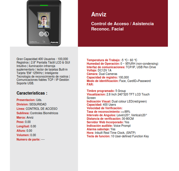 El lector de reconocimento facial FacePass Pro supone un gran avance en innovación de sistemas biométricos. Empleando el nuevo algoritmo BioNano y una potente plataforma de hardware se asegura que la velocidad de identificación del terminal es de menos de 1 segundo. Una fuente de luz infrarroja avanzada garantiza la iluminación al lector, incluso en oscuridad total. Es un dispositivo de seguridad apropiado para cualquier tipo de usuario, independientemente de la complexión, la expresión facial, el peinado, y el vello facial.