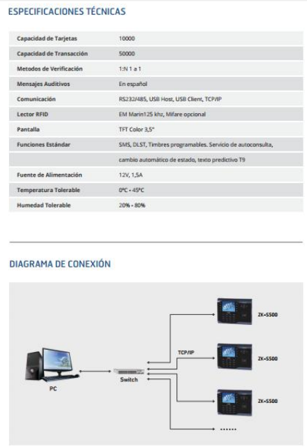 Es posible administrar el S500 por red con su interfaz TCP/IP o mediante conexión USB, RS485 o Serial y cuenta con puerto USB para la transferencia manual de datos usando una memoria USB