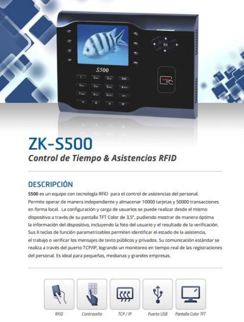 El S500 es un checador de Asistencia mas preciso por tarjetas de proximidad ya que le permite tener las estadísticas de entradas y salidas a sus instalaciones de todo el personal que labore en él. El S500 almacena hasta 10,000 tarjetas de proximidad de 125 khz. que se almacenan internamente para autentificar el acceso de los usuarios a sus instalaciones.