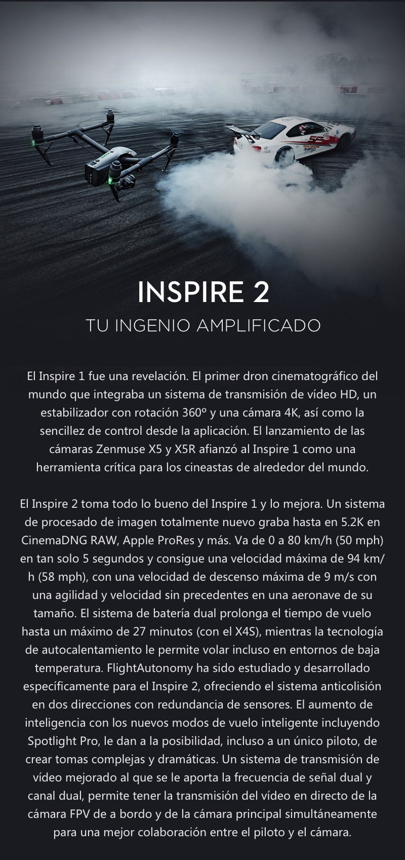La Zenmuse X5S tiene un mejorado sensor M4/3 que hace fotos de 20.8 MP y graba vídeo en Apple ProRes en 5.2K En comparación con las cámaras con estabilizador de DJI anteriores, las X5S tiene un mejor ratio señal/ruido y un rango dinámico de hasta 12.8 pasos. Con el control remoto Cendence y un monitor ultrabrillante CrytalSky, el Pack Profesional del Inspire 2 establece un nuevo estándar en imagen aérea, abriendo nuevas posibilidades creativas.