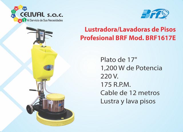La mejor oferta en Perú de Lustradora Lavadora BRF BRF1617E 1200W 1F 220V Perú. El mejor Lustradora Lavadora BRF BRF1617E 1200W 1F 220V al mejor Precio en Perú. Estamos Ubicados en Lima, Arequipa, Cusco, Huancayo, Piura, Trujillo, Cusco, Moquegua, Chiclayo, Ica, Pucallpa, Cajamarca, Huánuco, Puno y En todo el Perú. Precios de Oferta y con Descuentos.