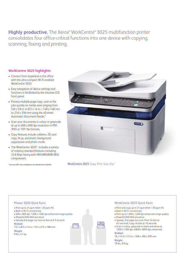 Puede tener un negocio pequeño, pero grandes necesidades. La multifunción WorkCentre 3025 ultra compacta fue desarrollada para usuarios individuales. La configuración es rápida, el uso diario es simple, y el trabajo de impresión rápido. Además, la WorkCentre 3025 extiende la productividad de su oficina al usar una máquina confiable para imprimir, copiar, escanear y enviar fax, y todo a un precio accesible.