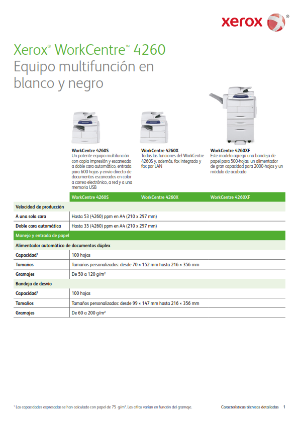La impresora multifunción Xerox WorkCentre 4260 combina funciones de copiado, impresión, escaneo a color y fax de primer nivel con confiabilidad y facilidad de uso excepcionales. Ofrece numerosas características multifunción para departamentos en un dispositivo para tamaño carta y A4, por ejemplo, impresión a dos caras, funciones de red, alimentador automático de documentos a dos caras para 100 hojas y disco duro de 80 GB (todas se ofrecen en la versión estándar).