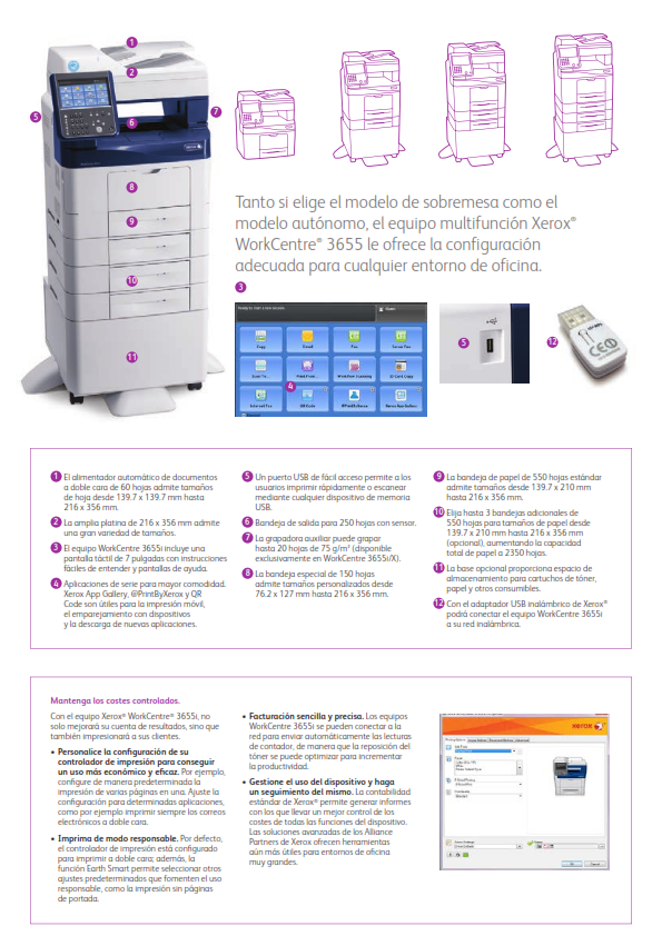 Los Xerox WorkCentre 3655X imprime, escanea, copia y fax. Las oficinas pueden producir documentos rápidamente con velocidades de salida nominal de 47 cpm y grabados primeros en tan sólo 12 segundos. Con fácil acceso a los usuarios del puerto USB WorkCentre 3655X puede imprimir o escanear rápidamente de directamente a un dispositivo de memoria USB. El Xerox WorkCentre 3655X acepta fácilmente una variedad de rendimiento del tóner. Los toners de mayor rendimiento reducirá su coste por página y ahorrar dinero a su oficina. El rendimiento del cartucho de tóner estándar negro WorkCentre 3655X produce un estimado de 6.100 páginas. El cartucho de tóner de alto rendimiento WorkCentre 3655X produce una estimación de 14.400 páginas. El cartucho de tóner de alto rendimiento extra WorkCentre 3655X tiene un rendimiento estimado de 25.900 páginas. La capacidad de papel en Xerox WorkCentre 3655X puede comenzar con una sola bandeja de papel bandeja de hojas y 150 de bypass de 550 hojas. Aumentar la capacidad de papel con otra bandeja de papel de 550 hojas. Capacidades de manejo de papel versátiles en el WorkCentre 3655X como el 60 hojas alimentador de documentos, cristal de copia, y 20 hojas de posición única grapadora mejorarán la productividad de su oficina.