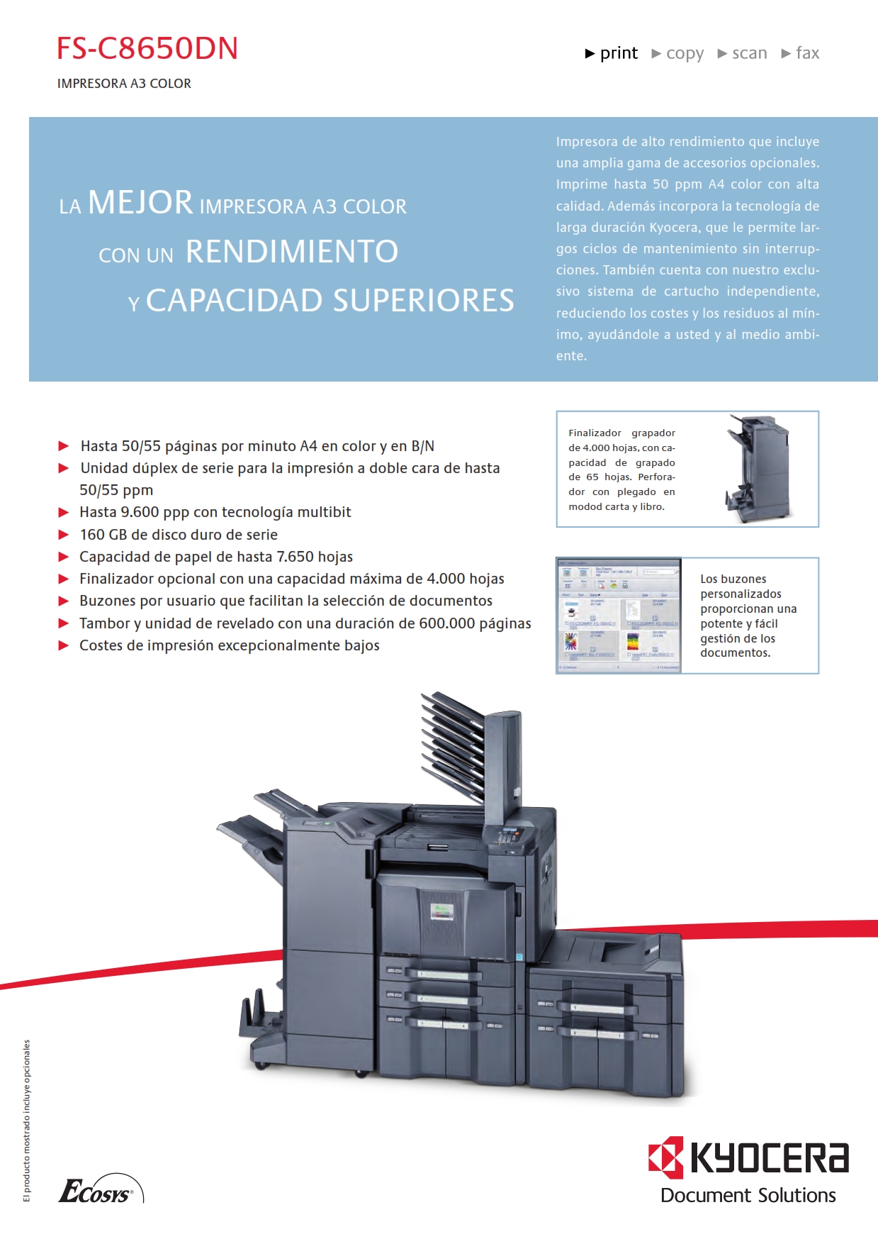 Impresora de alto rendimiento que incluye una amplia gama de accesorios opcionales. Imprime hasta 50 ppm A4 color con alta calidad. Además incorpora la tecnología de larga duración Kyocera,que le permite largos ciclos de mantenimiento sin interrupciones. También cuenta con nuestroexclusivo sistema de cartucho independiente, reduciendo los costes y los residuos al mínimo, ayudándole a usted y al medio ambiente.