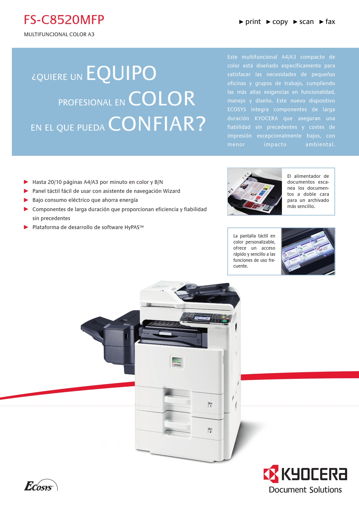 • Tecnología: Kyocera ECOSYS, láser color con plataforma de desarrollo de software HyPAS™