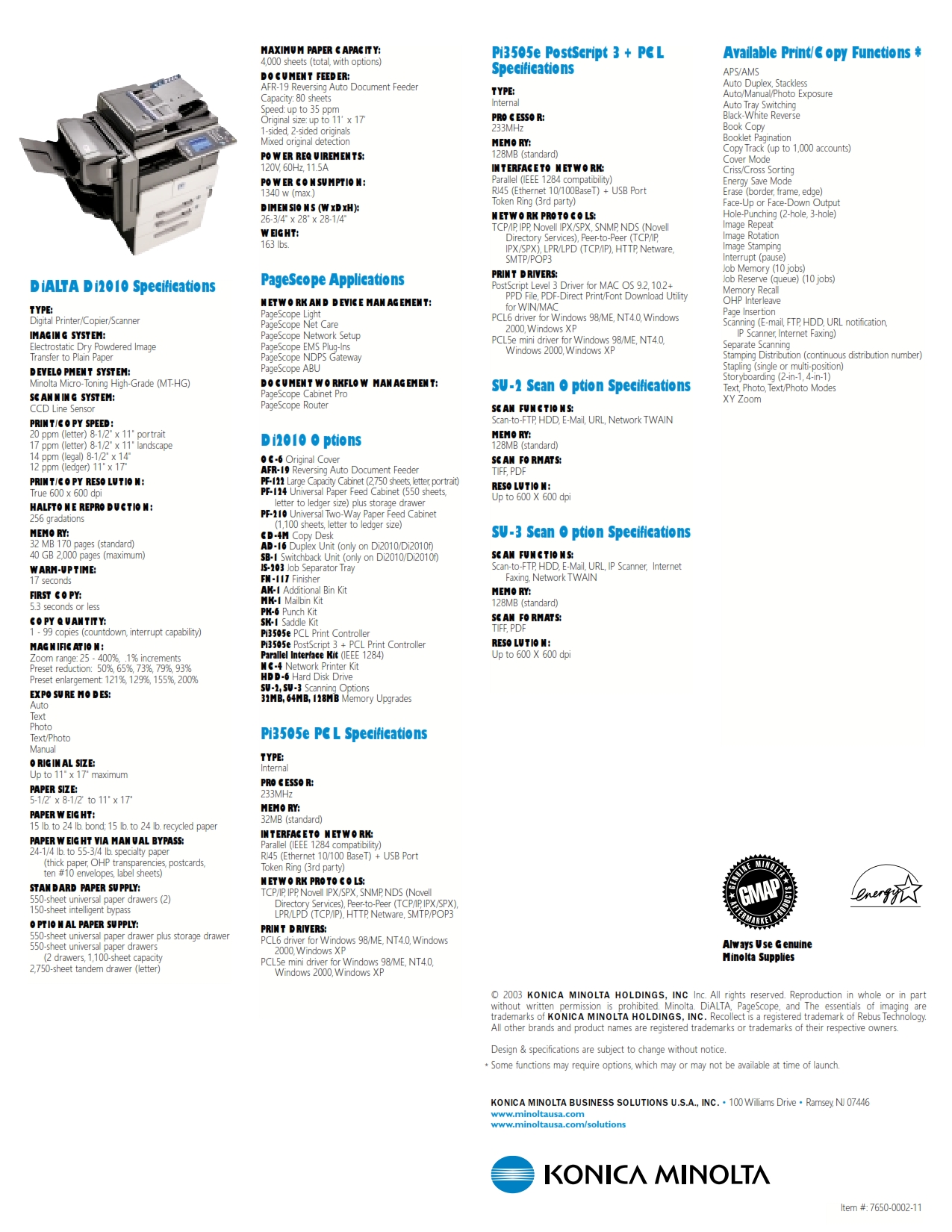 Konica Minolta lanzó la Di2010 Fue diseñado para pequeños grupos de trabajo con un ciclo de trabajo mensual de 60.000 impresiones. Las primeras copias se imprimen en 5,3 segundos y la velocidad de multi-copia es de 20 páginas por minuto. La Di2010 bizhub una copiadora estándar con impresora y escáner funciones opcionales.