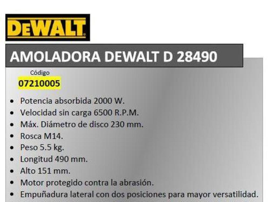 La mejor oferta en Perú de Amoladora DEWALT D28490 Perú. El mejor Amoladora DEWALT D28490 al mejor Precio en Perú. Estamos Ubicados en Lima, Arequipa, Cusco, Huancayo, Piura, Trujillo, Cusco, Moquegua, Chiclayo, Ica, Pucallpa, Cajamarca, Huánuco, Puno y En todo el Perú. Precios de Oferta y con Descuentos.