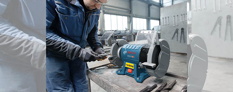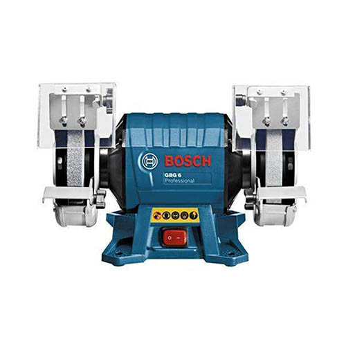 Esmeril de banco GBG 6 BOSCH, la maquina de taller compacta para amolar y afilar cuchillas, cinceles y brocas, eliminar el óxido de las piezas de metal, etc. Genera muy poco ruido y bajas vibraciones, gracias al motor de inducción sin mantenimiento. Disponen de una larga vida útil, debido al rodamiento de bolas estanco y la protección contra el polvo en interruptores y motor.