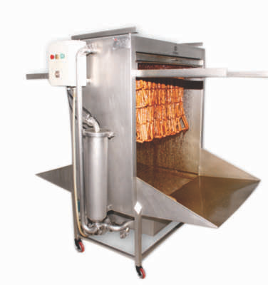 El humo líquido se distribuye a través de una bandeja, ubicada en la parte superior del techo del ahumador, en forma de lluvia uniforme.