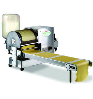 La máquina para crepes cuadrados produce una cinta con ancho de 160 / 200 mm y una longitud determinada por un temporizador (largo minimo 20 mm)