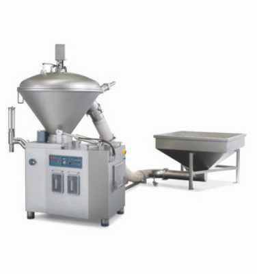 La embutidora Risco específica para el relleno de jamón y trozos grandes de carne. El modelo RS 2005V está equipado con una tolva de 400 litros de capacidad, y puede ser conectado a una tolva de piso grande. Durante la carga del producto y durante la operación de llenado, están en acción dos circuitos independientes de vacío y la tolva mantiene el vacío para garantizar la completa extracción del aire, con un resultado final del producto extremadamente compacto y con la máxima densidad. El sistema confiable de llenado Risco en el modelo RS 2005V posee un gran volumen en las cámaras de 2,5 kg adecuado para el músculo entero, esta gran área se utiliza para poner a resguardo piezas enteras de carne, junto con el transporte de piezas delicadas, garantizando una alta calidad en la compactación del producto final, en la uniformidad y en el color. La embutidora se puede conectar fácilmente y operar en sincronismo con una guillotina de una o dos cabezas para la producción en molde o en termoformado. El modelo RS 2005 V también se puede sincronizar con las máquinas clipadoras. Un sistema de freno de la tripa ofrece la solución por embutir tripas de gran calibre. La tensión de la parada de la tripa se ajusta automáticamente por el sistema de frenos a fin de comprimir de manera uniforme el producto y facilitar la operación.