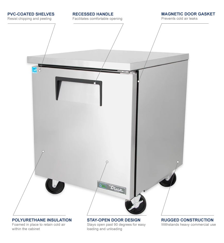 El verdadero congelador bajo mesada TUC-27F-HC tiene un exterior de acero inoxidable que no se rayará ni abollará fácilmente. Su forro interior de aluminio de capa transparente resiste la corrosión y la limpieza es simple con esquinas redondeadas. El producto se almacena en el piso de acero inoxidable y en dos estantes ajustables recubiertos de PVC. Abrir la puerta es fácil con su manija empotrada de 12 pulgadas. Si el operador necesita limpiar debajo de la unidad, puede moverse con sus ruedas de 5 pulgadas.