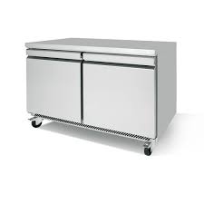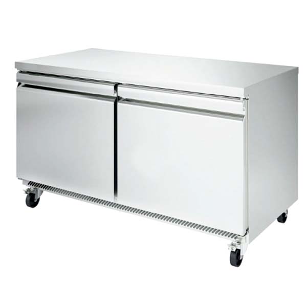 Congelador debajo del mostrador, dos secciones, 14.0 pies cúb. capacidad (2) puertas sólidas de cierre automático con cerradura, controlador termostático, estantes de alambre revestidos de plástico (4), ruedas de bloqueo de 4 ", refrigeración autónoma montada en la parte inferior, tapa de acero inoxidable de la serie 300, parte delantera de acero inoxidable, Laterales e interiores, 3/8 HP, 115v / 60/1, 8.5 amperios, cable, NEMA 5-20P, ETL, NSF 7