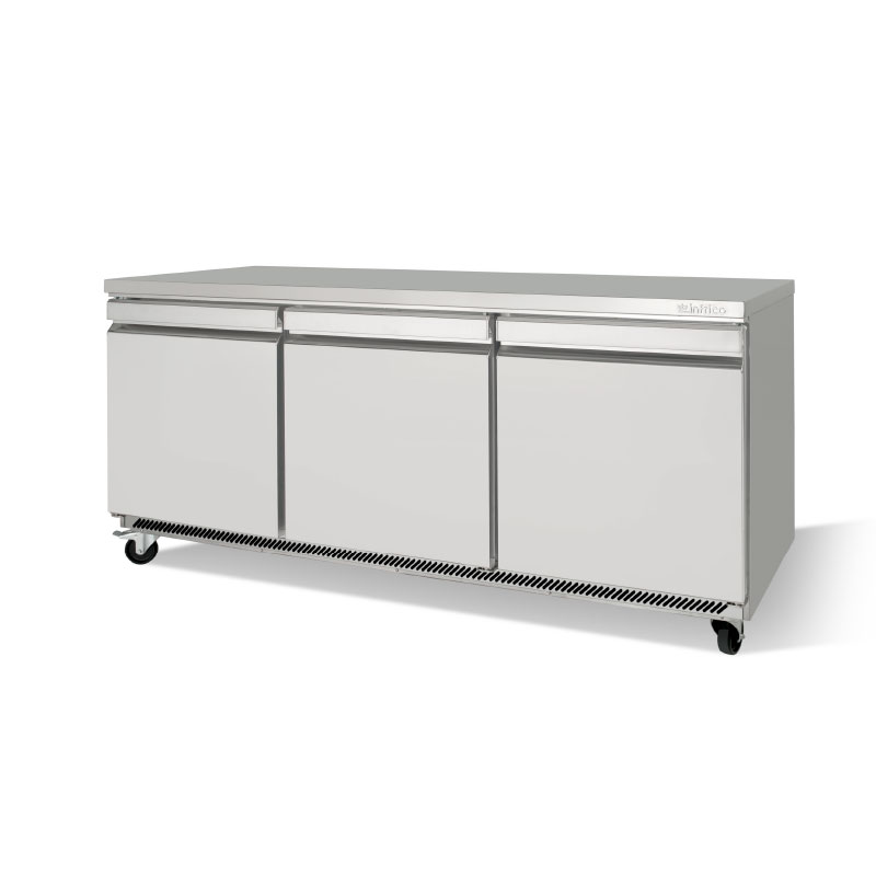 Refrigerador para debajo del mostrador, tres secciones, 21.0 pies cúb. capacidad del pie, (3) puertas de cierre automático, (2) estantes de alambre revestidos de plástico, ruedas de bloqueo de 4 ", refrigeración autónoma montada en la parte inferior, tapa de acero inoxidable de la serie 300, parte frontal, laterales y interior de acero inoxidable, 3/8 HP , 115v / 60/1, 7.6 amperios, cable, NEMA 5-15P, ETL, NSF 7