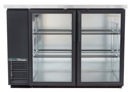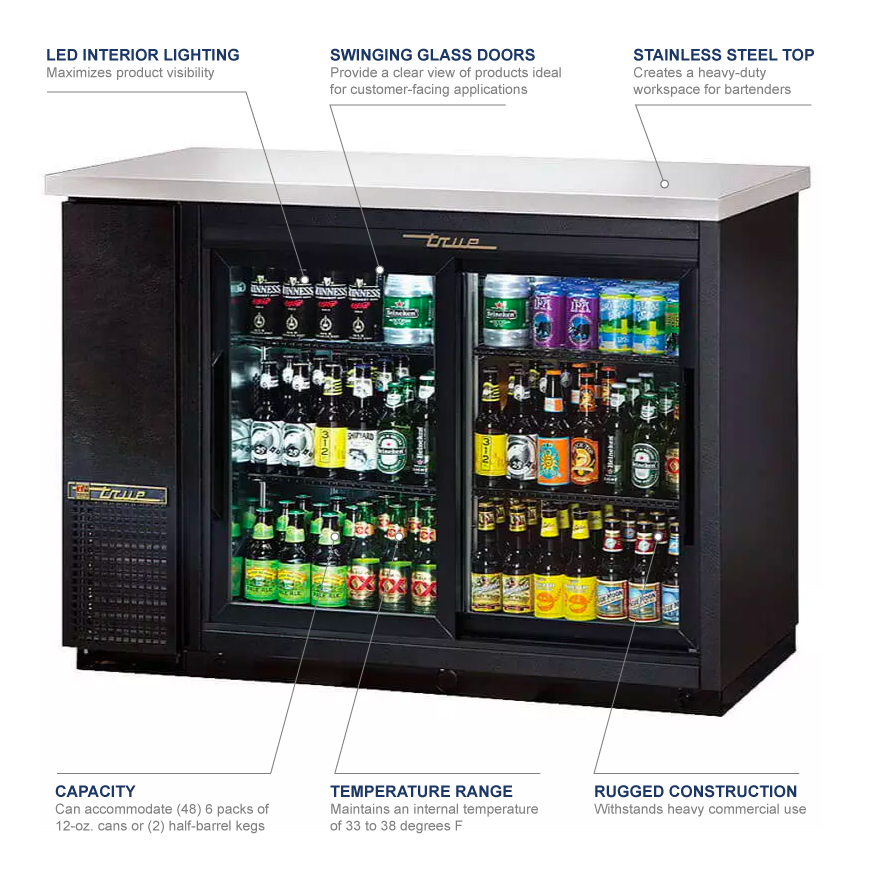 Refrigerador de barra posterior, dos secciones, 24 "de profundidad, 35-5 / 8" de alto, (48) paquetes de 6 o (2) capacidad de 1/2 barril, (4) estantes de cables, unidad de condensación en la parte izquierda, tapa de acero inoxidable , interior galvanizado con piso de acero inoxidable, exterior de vinilo negro, (2) puertas corredizas de vidrio, luz interior LED, refrigerante de hidrocarburo R290, 1/5 HP, 115v / 60/1, 2.1 amperios, NEMA 5-15P, cULus, UL EPH Clasificado, hecho en estados unidos