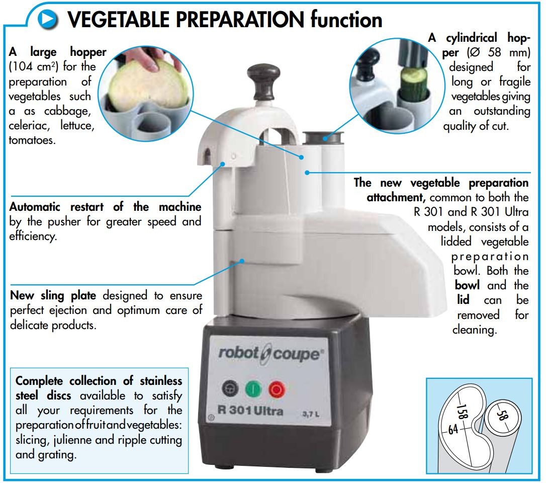 El dispositivo Robot Coupe R301 Ultra de preparación de vegetales y el procesador de alimentos en general es un dispositivo fácil de usar y con muchas funciones que simplifica la obtención de resultados de preparación súper profesionales con el mínimo esfuerzo. Los discos de corte de 650 vatios de potencia, 1500 rpm y el control de pulso brindan un corte tremendo con control cercano. Robot Coupe ofrece una excelente gama de cuchillas y discos de corte, y combinados con su sistema de alimentación de tolva cuidadosamente diseñado y el accesorio de preparación de vegetales, permiten una amplia gama de acabados de preparación y corte para frutas, verduras, hierbas, carnes y otros ingredientes procesados. Este es un aparato de preparación multifuncional.