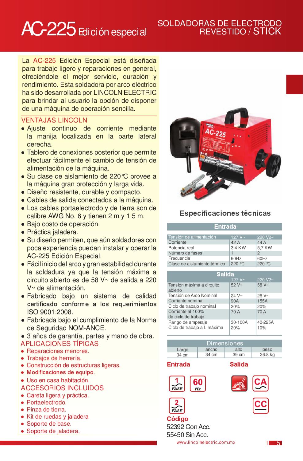 La AC-225 es el transformador más vendido por Lincoln Electric, ya que, garantiza un arco eléctrico de soldar AC muy suave y apreciado por los soldadores profesionales hasta aficionados, que permite soldar una gran variedad de materiales, entre ellos: aceros al carbono, bajos aleados, inoxidables y hierro colado.